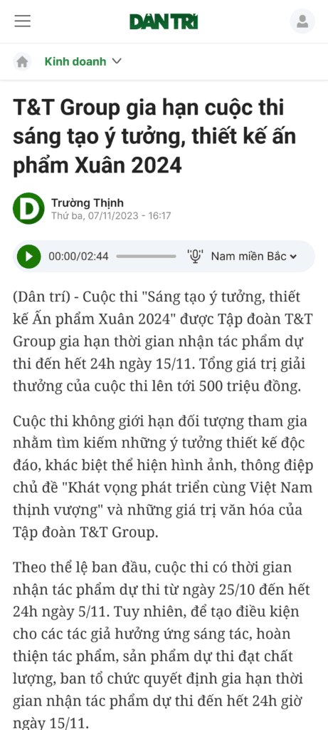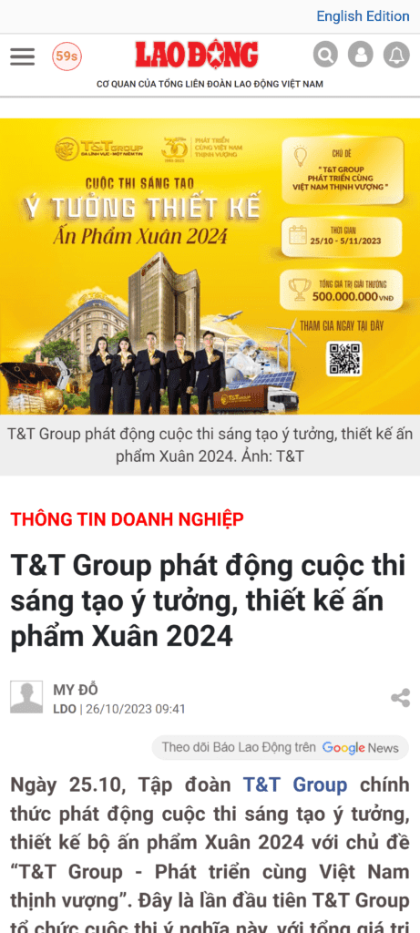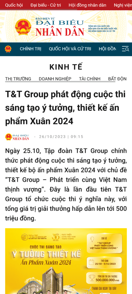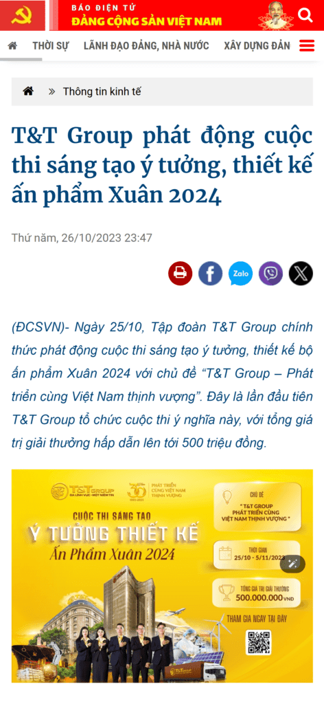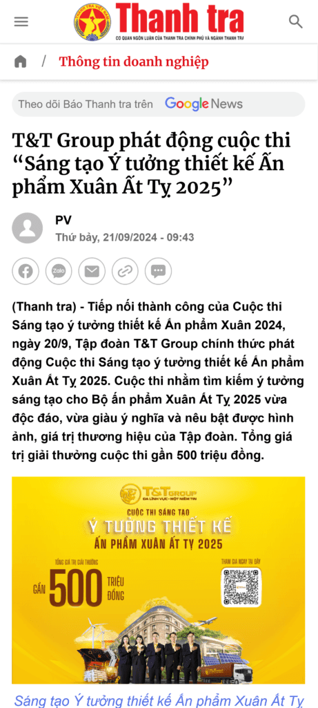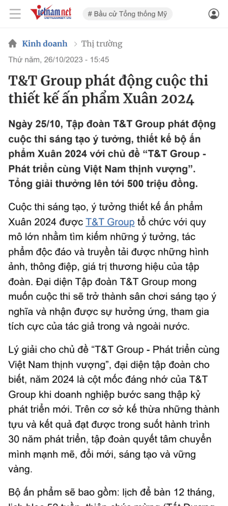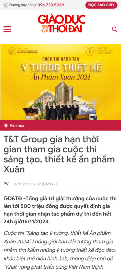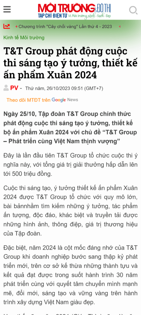 Cuộc thi “Sáng tạo ý tưởng, thiết kế Ấn phẩm Xuân 2024” do Tập đoàn T&T Group tổ chức là một sân chơi sáng tạo lớn, thu hút nhiều cá nhân và tổ chức tham gia với những ý tưởng độc đáo nhằm kỷ niệm hành trình 30 năm phát triển của tập đoàn.